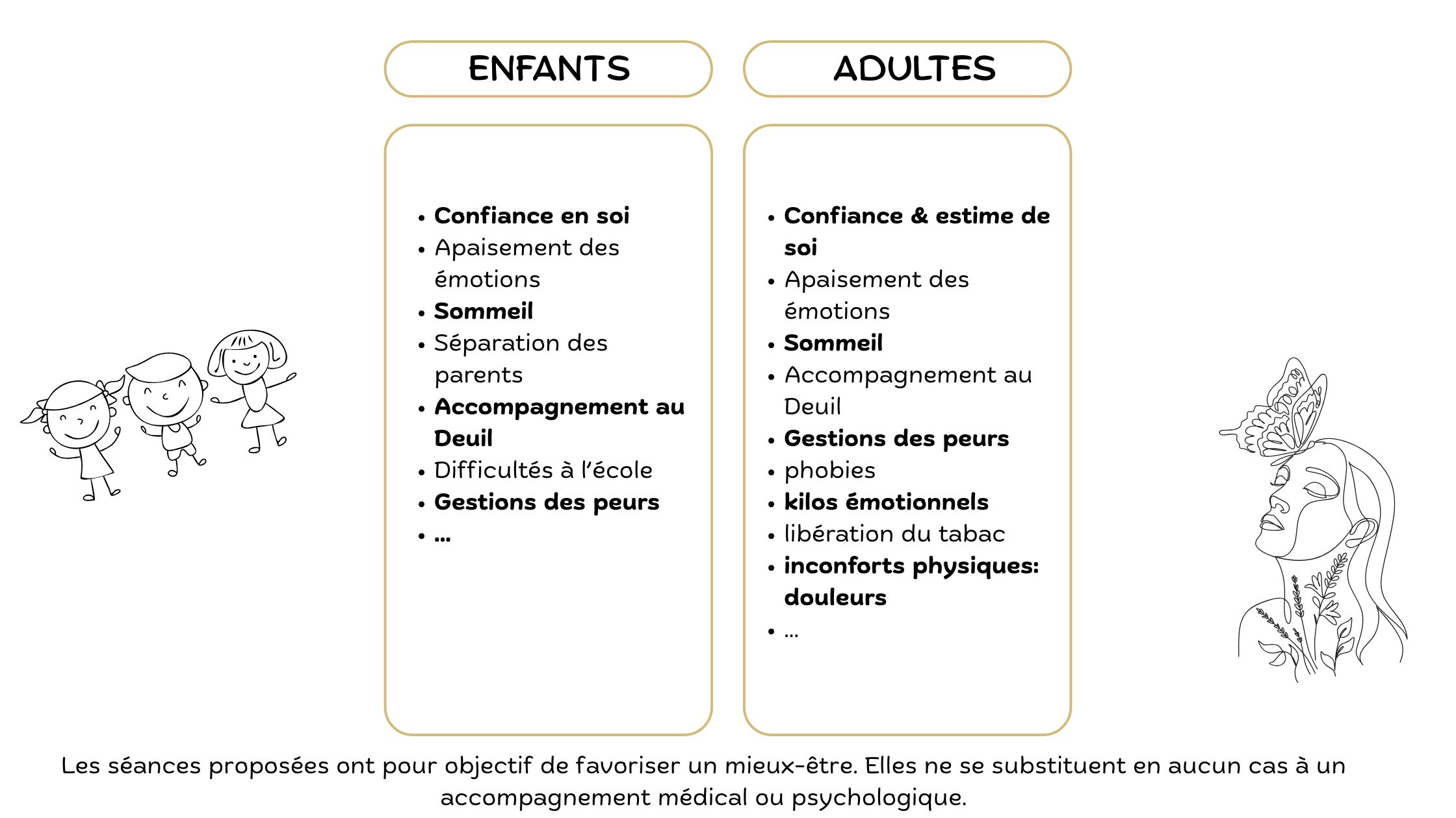 Les prestations que je propose ne sont pas réalisées par un professionnel de santé, conformément à l’article L4161-1 du Code de la Santé Publique.