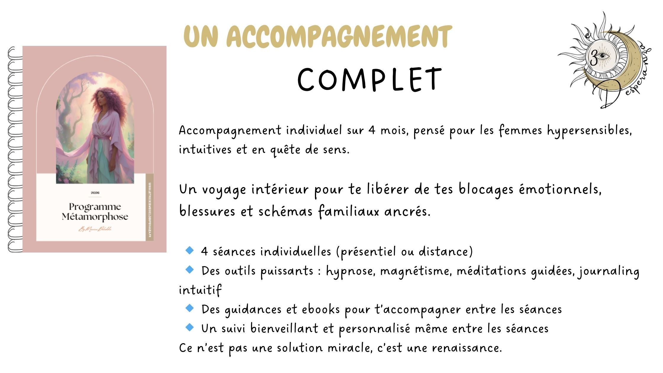 "Métamorphose" est né de mon propre cheminement, nourri par mes formations et par les expériences vécues auprès de centaines de femmes que j’ai guidées vers plus de légèreté, de fluidité et de confiance.